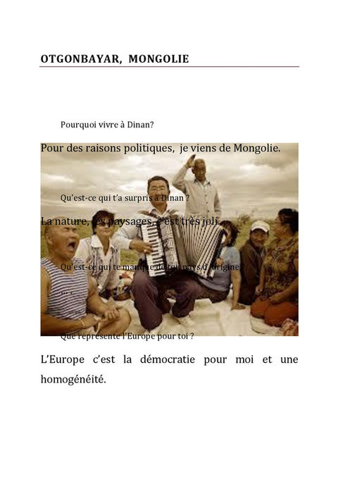 "Cette exposition était une expérience extraordinaire, une occasion excellente de connaitre des étrangers qui comme moi, sont partis de leurs pays et ont décidé pour différentes raisons de vivre à Dinan. Je suis une personne qui adore découvrir de nouvelles cultures dans toutes leurs richesses – les personnes, les traditions, les cuisines spécifiques de chaque région de l ‘Europe ou du monde entier, l’histoire, les films etc. Tout m’intéresse et tout me plait."